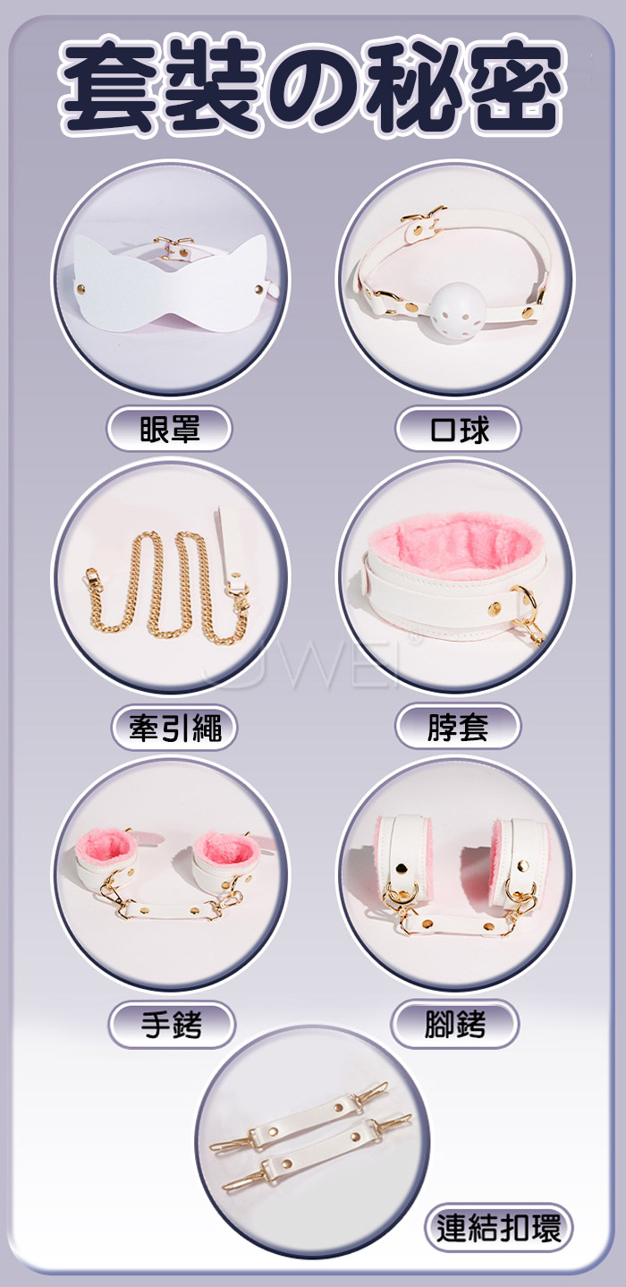 ■內容:眼罩、口球、連結扣、脖套、手銬、腳銬、牽引繩