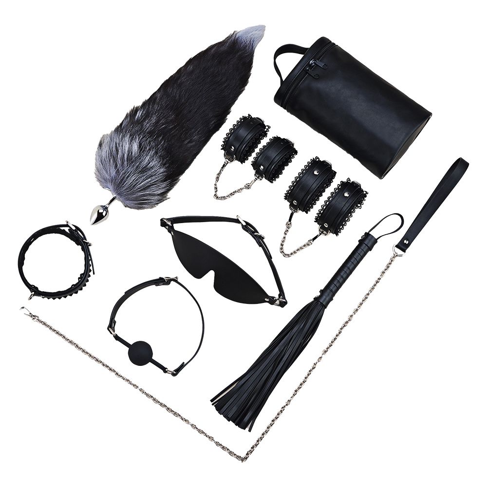| BDSM調教黑蕾絲花邊皮革8件套
