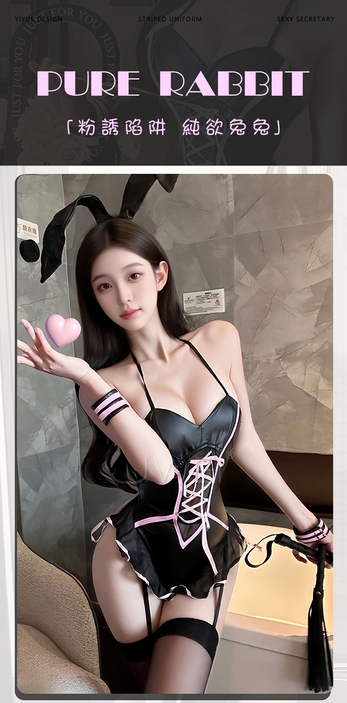 | 兔女郎角色扮演服!萌寵甜粉雪白酥胸圓環雙側露腰連身衣兩件組