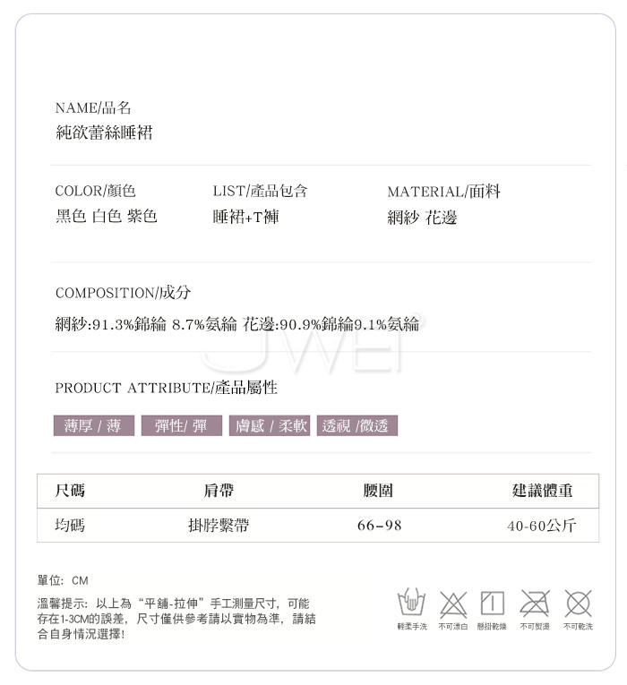 2.基於保障消費者個人衛生,情趣衣物類恕不接受退換貨,如為商品本身暇疵,接受三日內換貨,請勿試穿。