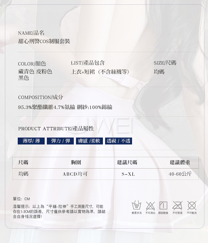 2.基於保障消費者個人衛生,情趣衣物類恕不接受退換貨,如為商品本身暇疵,接受三日內換貨,請勿試穿。